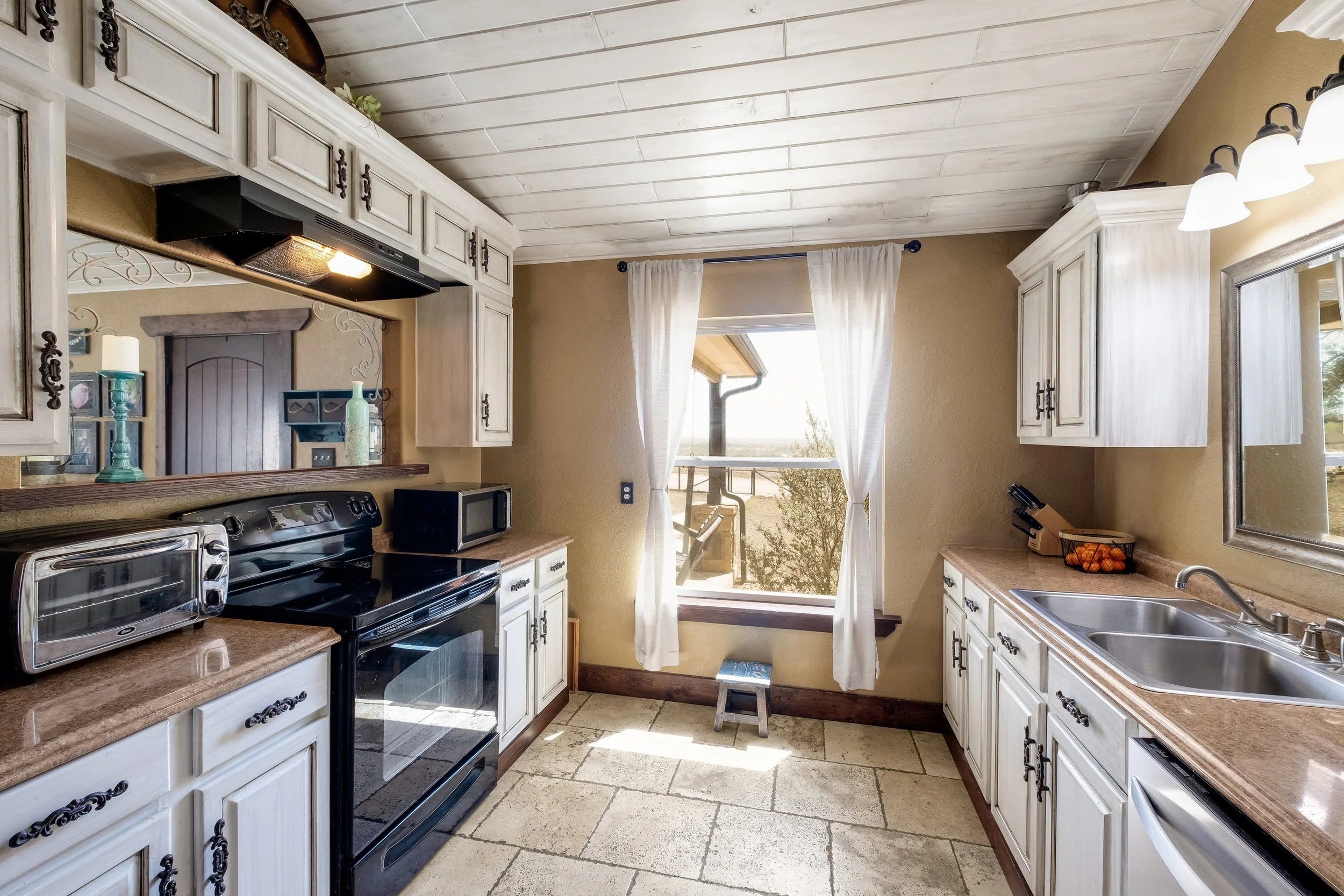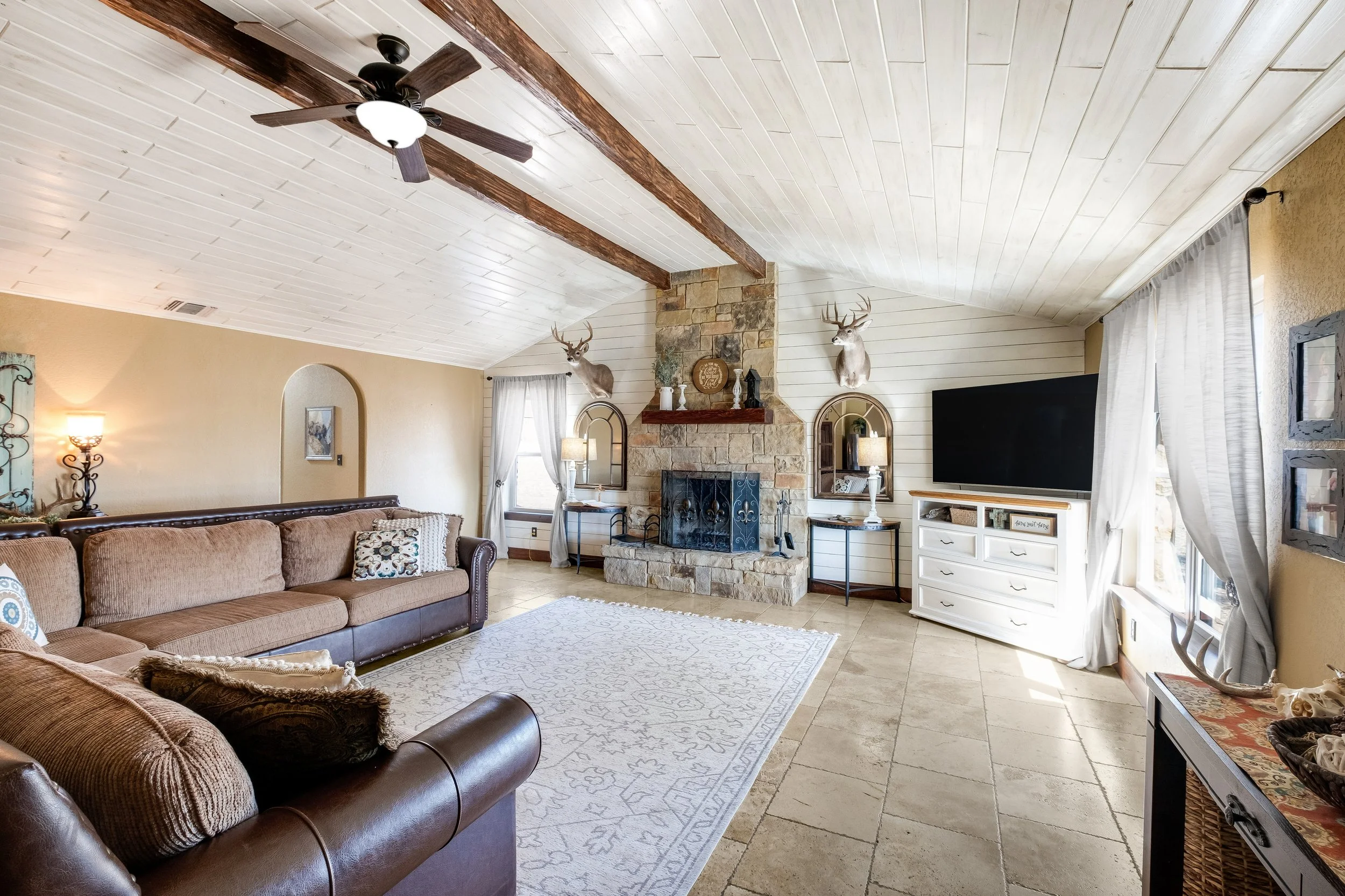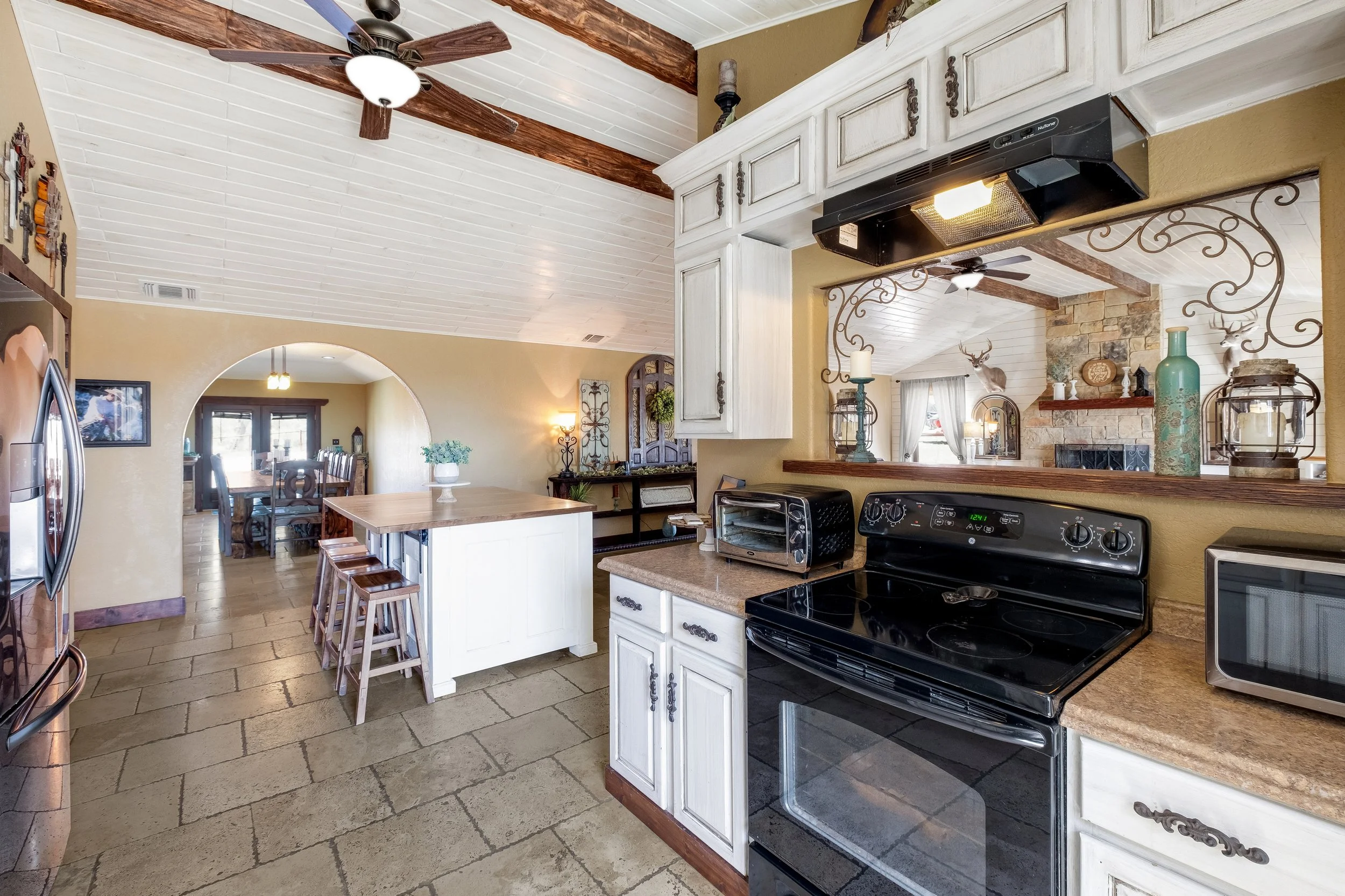 Escape to serene country living just minutes from Castroville, Texas. This 45.5-acre hilltop ranch offers a beautifully updated 2,850 sq ft rock home, perfect for those seeking tranquility and space. Enjoy expansive living areas with a wood-burning fireplace, soaring tongue-and-groove ceilings, and elegant tile floors flooded with natural light. The dining room, ideal for gatherings, comfortably seats fourteen. The master suite features a luxurious walk-in shower and generous closet space, while two additional bedrooms provide privacy on opposite ends of the home. A versatile fourth room can serve as an office or guest space. Start your day with breathtaking Medina Valley views from the front porch swings. The property also includes custom yard fencing, raised garden beds, and chicken coops. This hilltop ranch offers a unique blend of virgin brush and open pasture, ideal for homesteading, agriculture, or recreational pursuits. The land provides excellent wildlife habitat and ample grazing for livestock. This is more than a home; it's a lifestyle. Contact us for a private showing. The Seller will consider selling all or part.